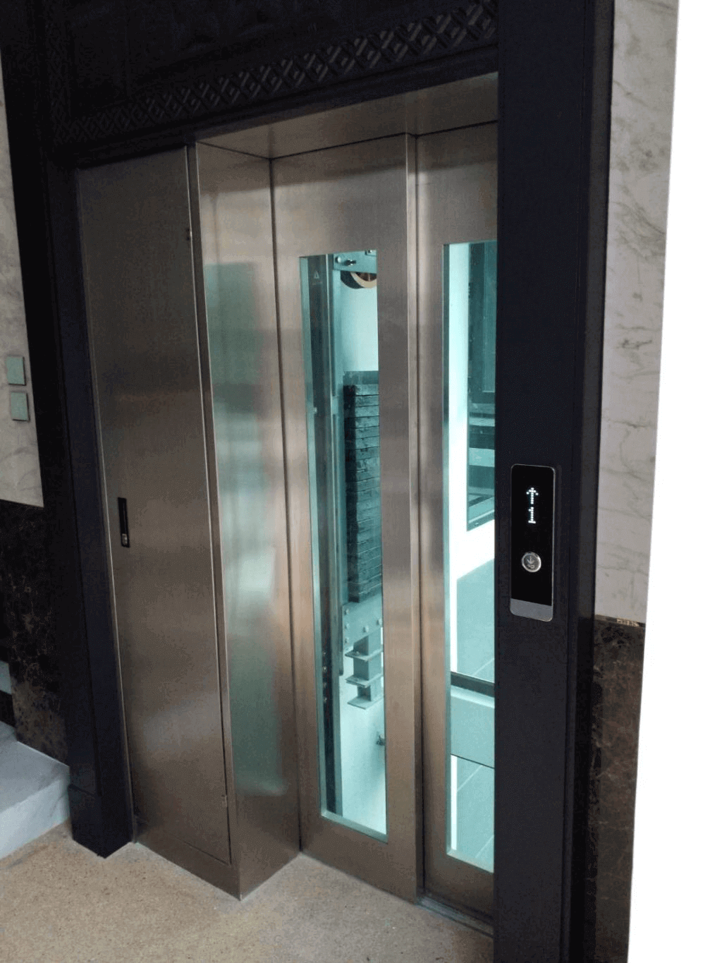 ประตูตัวลิฟต์ (ประตูใน) และ ประตูหน้าชั้น (ประตูนอก) เป็นกระจก